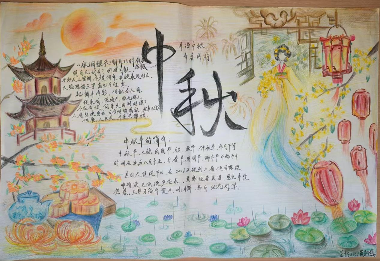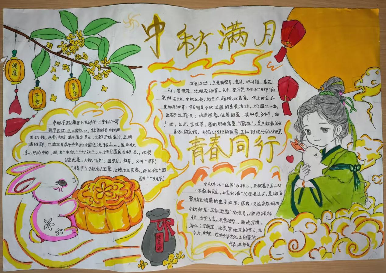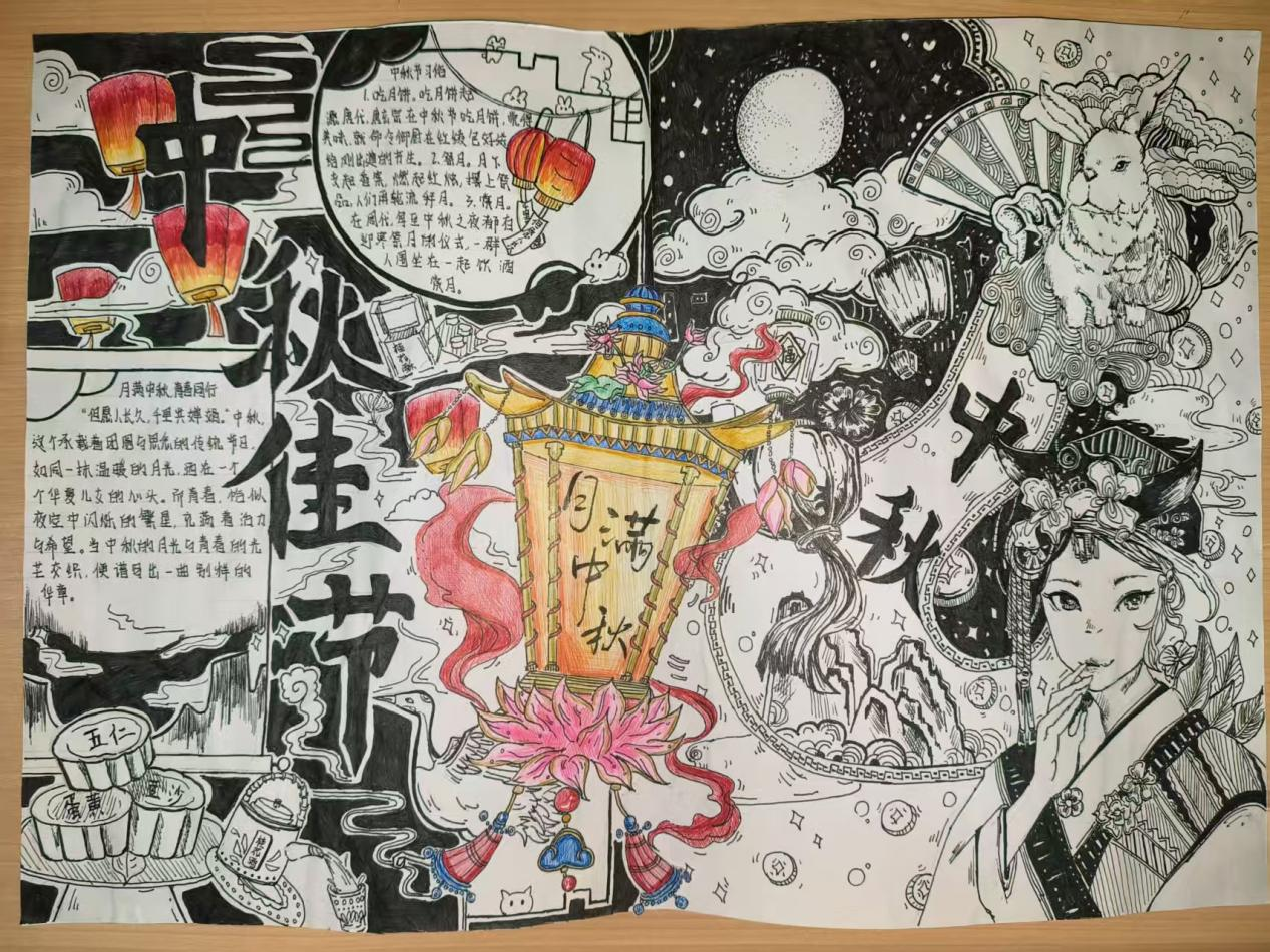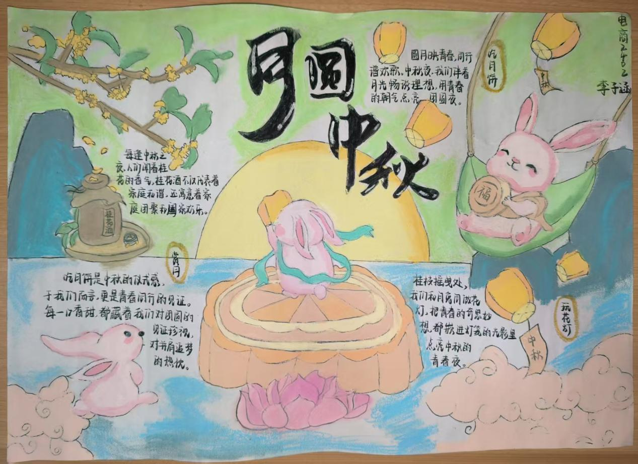 活动现场,学子们以笔为媒,将中秋元素与青春感悟融入创作。手抄报比赛中,同学们围绕“中秋传说”“家国情怀”主题展开构思,以细腻笔触勾勒嫦娥奔月、玉兔捣药的经典场景;书法比赛现场则墨香四溢,软笔组学子挥毫泼墨,“中秋安康”“喜乐团圆”等词句在宣纸间流淌,硬笔组作品则以工整笔触展现青年的严谨与朝气,一幅幅作品既饱含对传统节日的敬意,更传递出新时代青年的精神风貌。