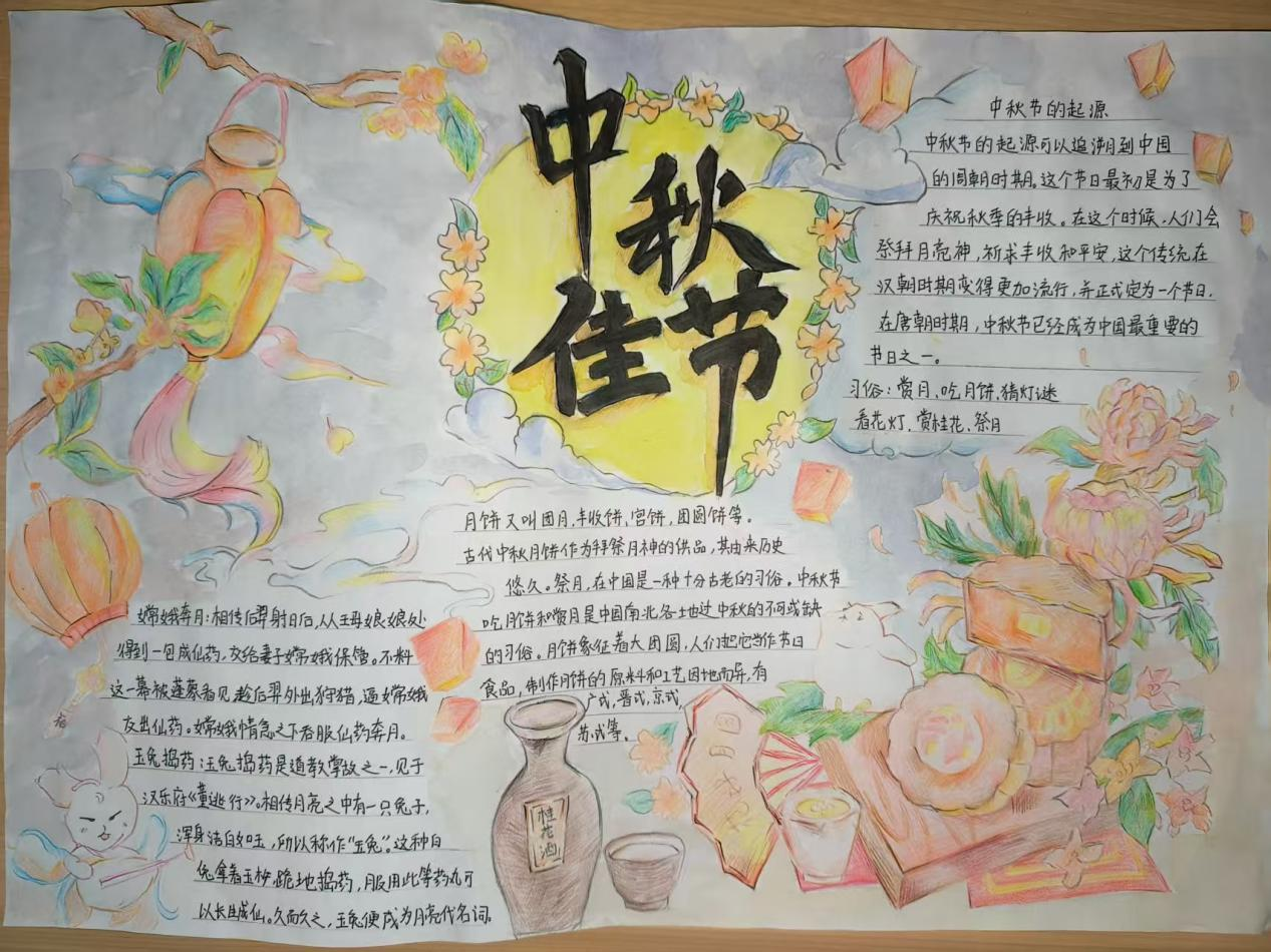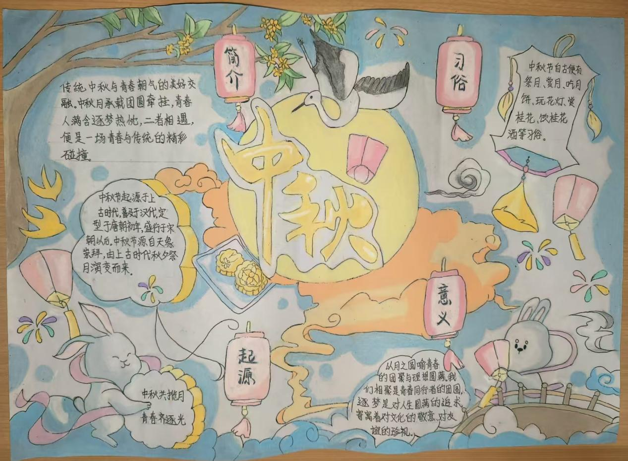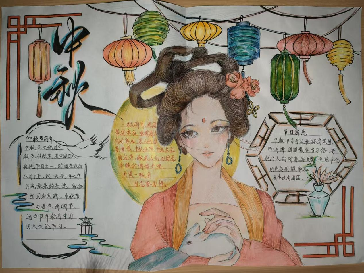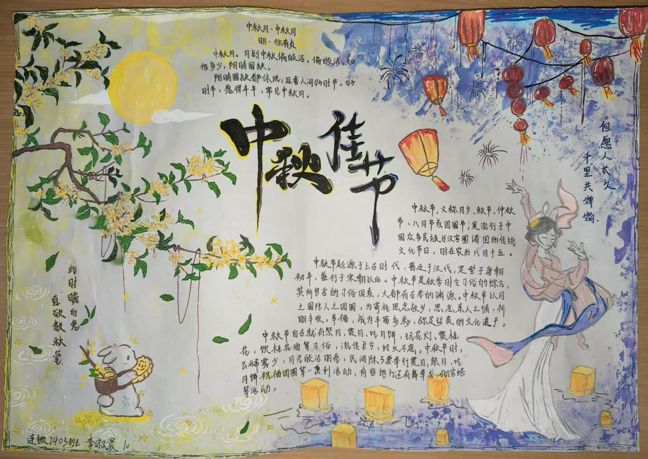 活动现场,学子们以笔为媒,将中秋元素与青春感悟融入创作。手抄报比赛中,同学们围绕“中秋传说”“家国情怀”主题展开构思,以细腻笔触勾勒嫦娥奔月、玉兔捣药的经典场景;书法比赛现场则墨香四溢,软笔组学子挥毫泼墨,“中秋安康”“喜乐团圆”等词句在宣纸间流淌,硬笔组作品则以工整笔触展现青年的严谨与朝气,一幅幅作品既饱含对传统节日的敬意,更传递出新时代青年的精神风貌。