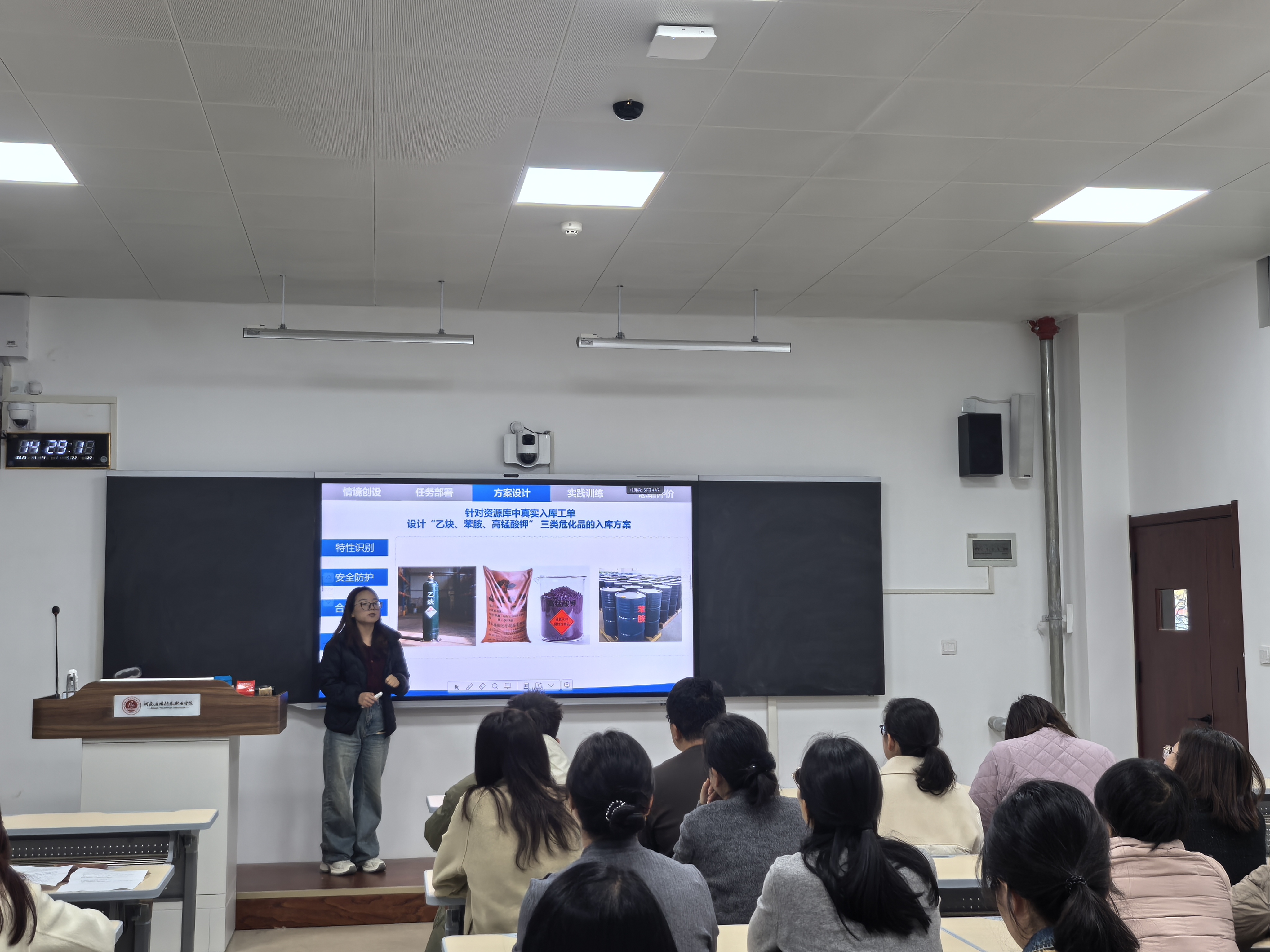 毛莉杰以《智慧仓配运营》课程教学实施报告为核心展开分享,系统呈现了课程的整体设计与实践成果。随后,聚焦《危化品入库方案设计》展开专项教学展示,以乙炔、苯胺、高锰酸钾三类危化品为教学载体,还原真实入库工单处理场景。教学过程中,毛莉杰围绕“特性识别、安全防护、合规验收、应急预案”四大核心模块,通过虚拟仿真实验、案例探讨、风险分析等多种教学方式,引导学生掌握危化品入库的关键要点。