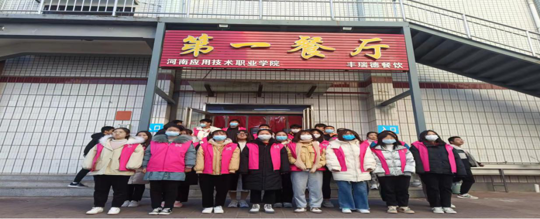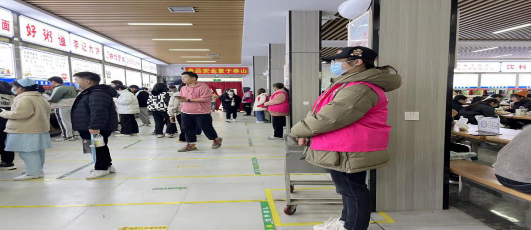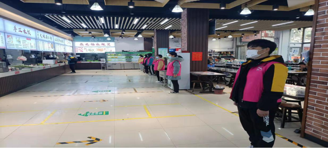 就餐高峰期前,我院志愿者统一佩戴好口罩,穿上粉马甲,来到学生食堂的各个出入口执勤。志愿者们坚守在自己的岗位,采取“看、引、劝”的方式,对就餐高峰期学生的就餐秩序进行现场督查,确保食堂就餐环境文明有序。