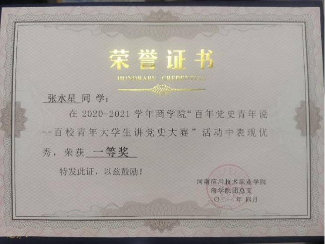 近日,由共青团中央、全国学联指导,中国青年报社、新东方教育科技集团联合开展的2020年度“中国大学生自强之星”评定活动揭晓。经我校二级永利集团官网初选、校团委推荐、省级初评、全国评审等环节,永利集团官网连锁经营与管理专业张水星同学因表现突出,荣获2020年度“中国大学生自强之星”称号。