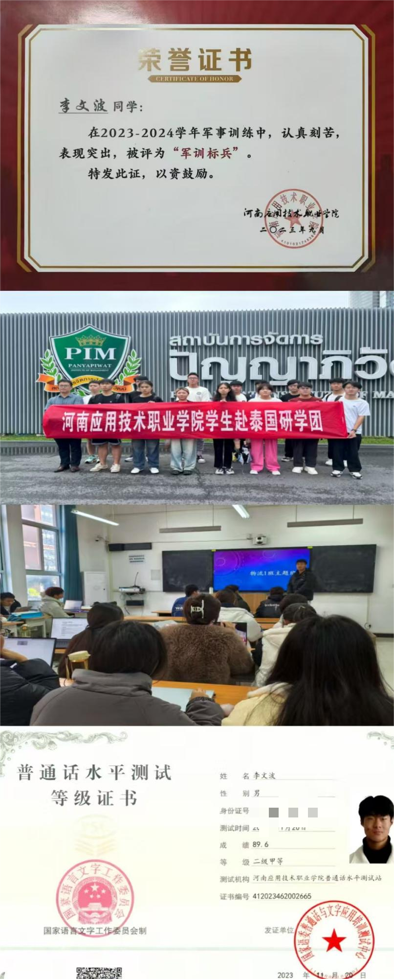 “实践是检验真理的唯一标准”,李文波始终注重将所学知识应用于实践,在各类实践活动中锤炼品格、提升能力。他积极参与志愿服务,在图书馆志愿服务中,协助管理员整理书籍、引导读者借阅,用耐心与细心为他人提供便利,体会奉献的快乐;2023年11月,他参与学校实训室安全宣传活动,凭借扎实的安全知识与良好的表达能力,荣获三等奖。 2024年9月,他有幸作为全校出国研学学生代表,跟随校领导前往泰国PANYAPIWAT INSTITUTE OF MANAGEMENT等院校进行交流学习。此次研学让他深刻感受到不同文化的差异性与多样性,拓宽了国际视野,也更加坚定了文化自信。2024年6月至8月,他在广东博盈人力资源管理有限公司总工厂进行暑期实践,在流水线上从事装电极、套圈、质检、压机等工作,每天12小时的高强度工作让他深刻体会到劳动的艰辛,更培养了吃苦耐劳、坚韧不拔的精神;2023年10月至12月,他利用周末在郑州航空港区从事物流相关兼职,进一步熟悉了物流岗位的工作流程,将专业知识与实际工作深度融合,提升了实操能力。此外,2023年9月,他在新生军训中表现突出,荣获校级军训标兵称号;2023年12月,他凭借良好的语言表达能力,考取普通话二级甲等证书。