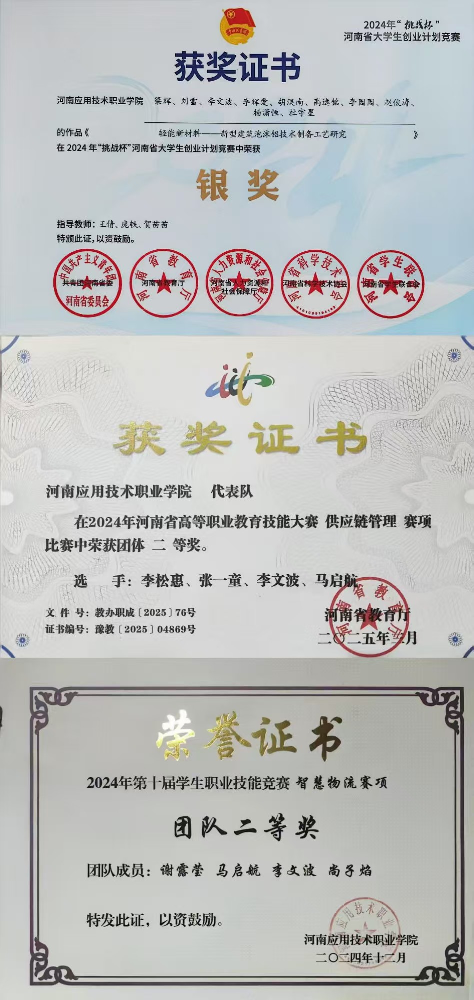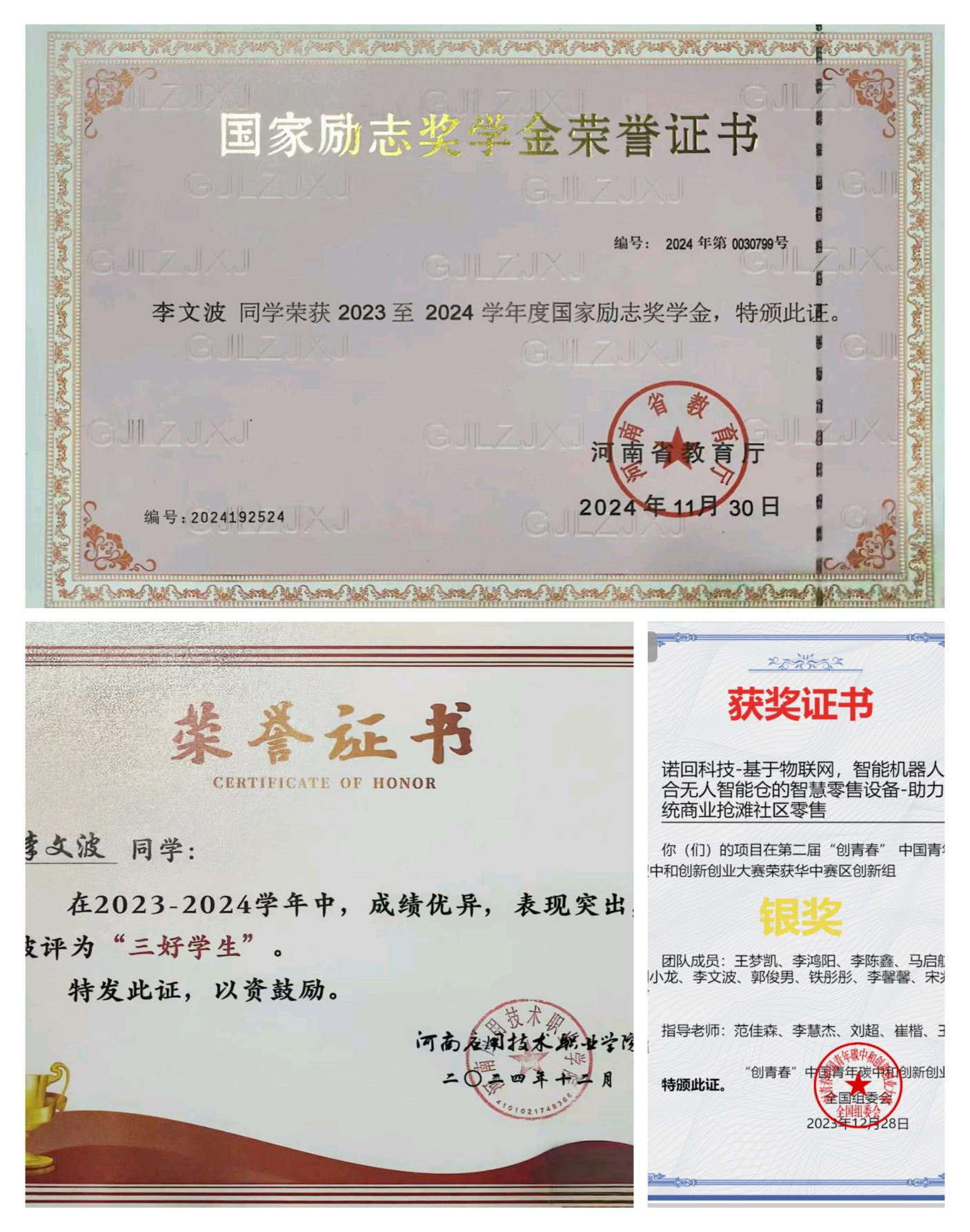 “成功在于积累,进步源于坚持。”李文波始终以严谨认真的态度对待学习,不仅课堂上专注听讲、积极互动,课后还主动拓展知识边界。他密切关注物流行业发展动态,大量研读智慧物流、冷链物流、绿色物流等前沿领域的研究报告与行业资讯,及时掌握行业新技术、新趋势。为提升实操能力,他积极参与学校实训课程,熟练掌握快递分拣、货物扫码入库、装卸搬运、仓储规划等核心物流技能,并顺利考取2023年11月河南省物流职业技能快递运营1+X证书,为职业发展奠定了坚实基础。此外,他深知复合型人才的重要性,利用课余时间自主学习经济学、管理学相关知识,努力构建全面系统的知识体系。凭借优异的学习成绩与突出的综合表现,他先后荣获2024年12月国家励志奖学金、2024年9月校级三好学生、2025年6月“河南省三好学生”等荣誉。