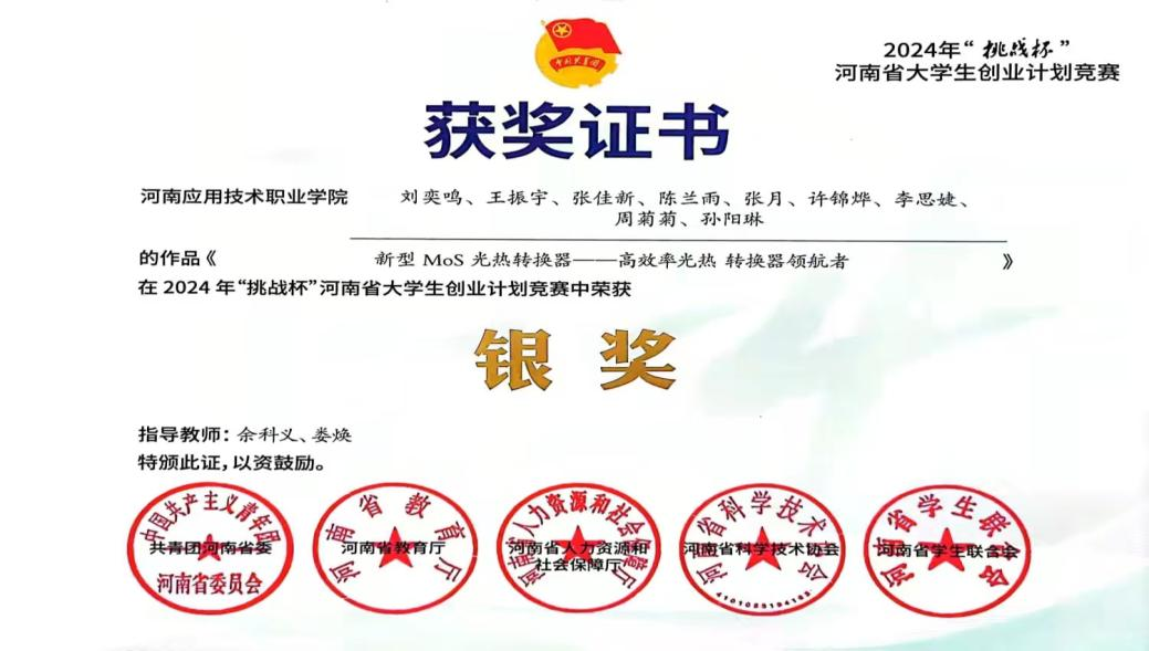 作为多个创新创业竞赛项目的核心成员,陈兰雨展现出出色的团队领导力和跨领域协作能力。在《新型MoS2光热转换器——高效率光热转换器领航者》项目中,她作为主要负责人之一,面对技术性强的专业内容,主动学习光热转换原理和技术参数,同时发挥市场营销专业特长,系统完成市场分析、商业模式设计和营销策略制定。在团队协作过程中,她善于倾听不同专业背景成员的意见,巧妙地将技术语言转化为市场语言,在技术创新与市场需求之间架起沟通的桥梁。备赛期间,她与团队成员共同钻研、反复打磨,经常为了完善方案讨论至深夜。最终,项目荣获“挑战杯”河南省大学生创业计划竞赛银奖。这个过程不仅提升了她的专业技能,更重要的是培养了她领导跨学科团队解决复杂问题的能力。