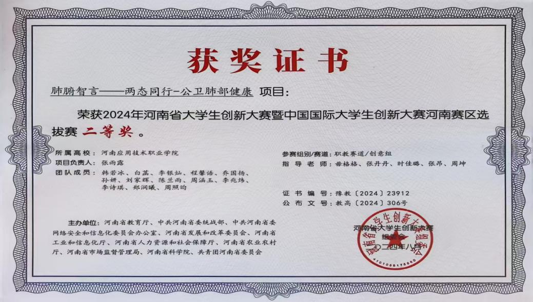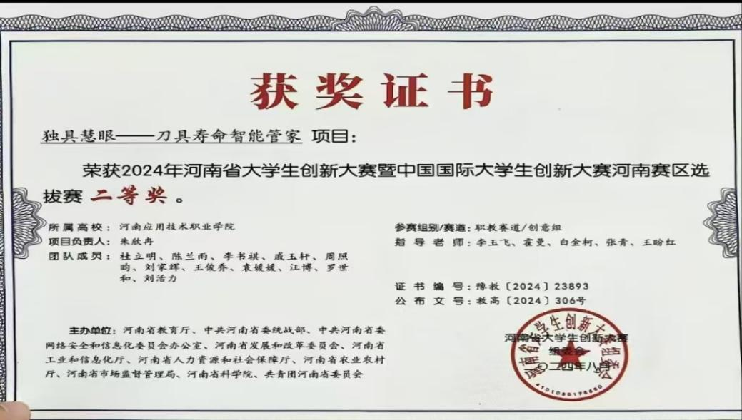 2024年荣获河南省大学生创新大赛暨中国国际大学生创新大赛二等奖