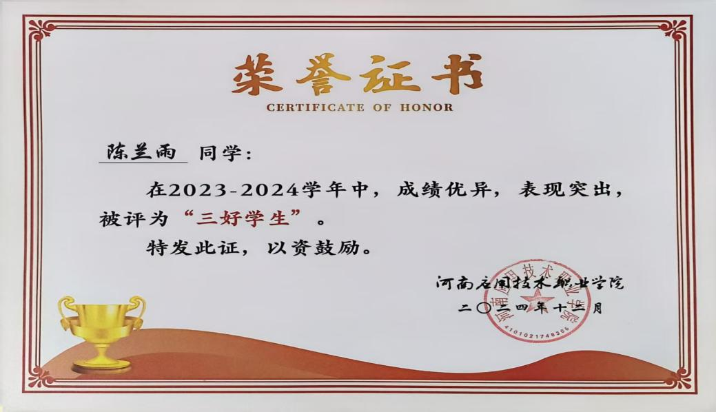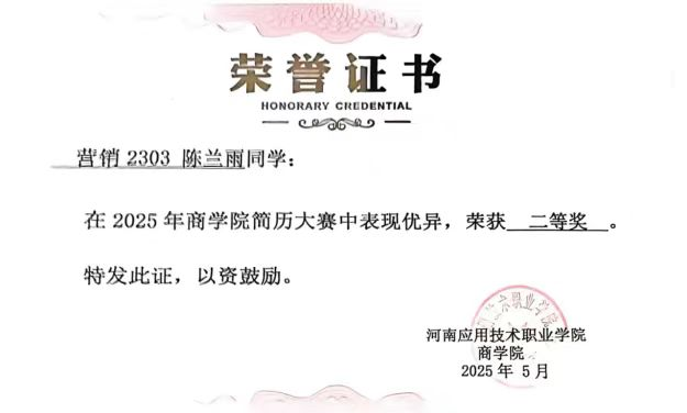 个人简介:陈兰雨,中共预备党员,永利集团官网永利集团官网市场营销2303班学生。入学以来始终保持严谨自律的学习态度,学习成绩与综合考评成绩稳居班级前3%。荣获国家励志奖学金、河南省三好学生、国家级奖项5项、省级奖项8项。她通过系统性的自主学习和跨领域探索,展现出卓越的自我驱动力和多元发展潜力。