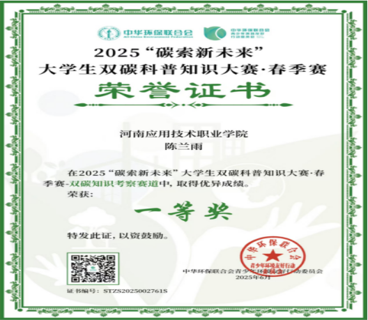陈兰雨展现出卓越的自我规划和管理能力,不局限于市场营销专业课程,主动探索人工智能、“双碳”政策等前沿领域。从大一开始,她主动规划学习路径,利用课余时间系统补充人工智能科技知识。她通过自学相关内容,克服专业知识壁垒关键技术,最终顺利通过人工智能训练师(初级)认证。同时,她密切关注国家“双碳”战略,自主研读相关政策和行业报告,构建起跨领域的知识体系。这一系列自我驱动的学习实践,不仅拓宽了她的知识视野,更显著提升了她的信息整合与自主学习能力。正因如此,她在竞争中脱颖而出,收获奖项。