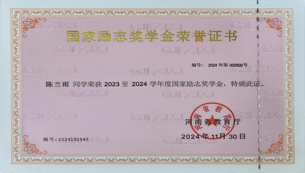 2023至2024学年获得“ 国家励志奖学金”