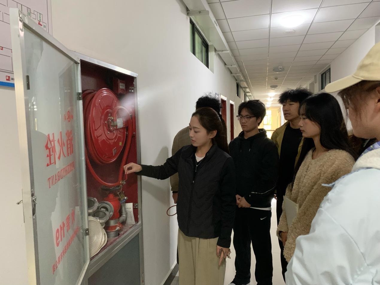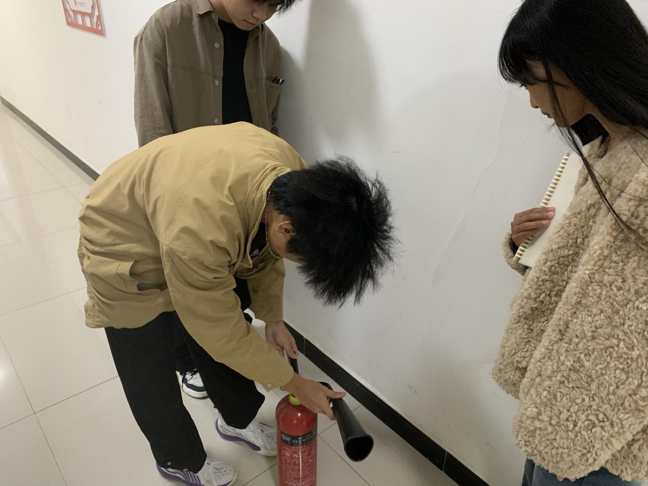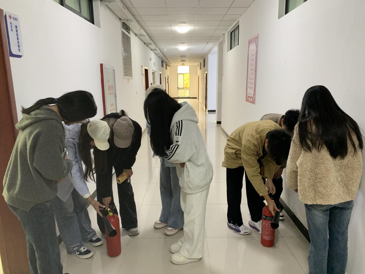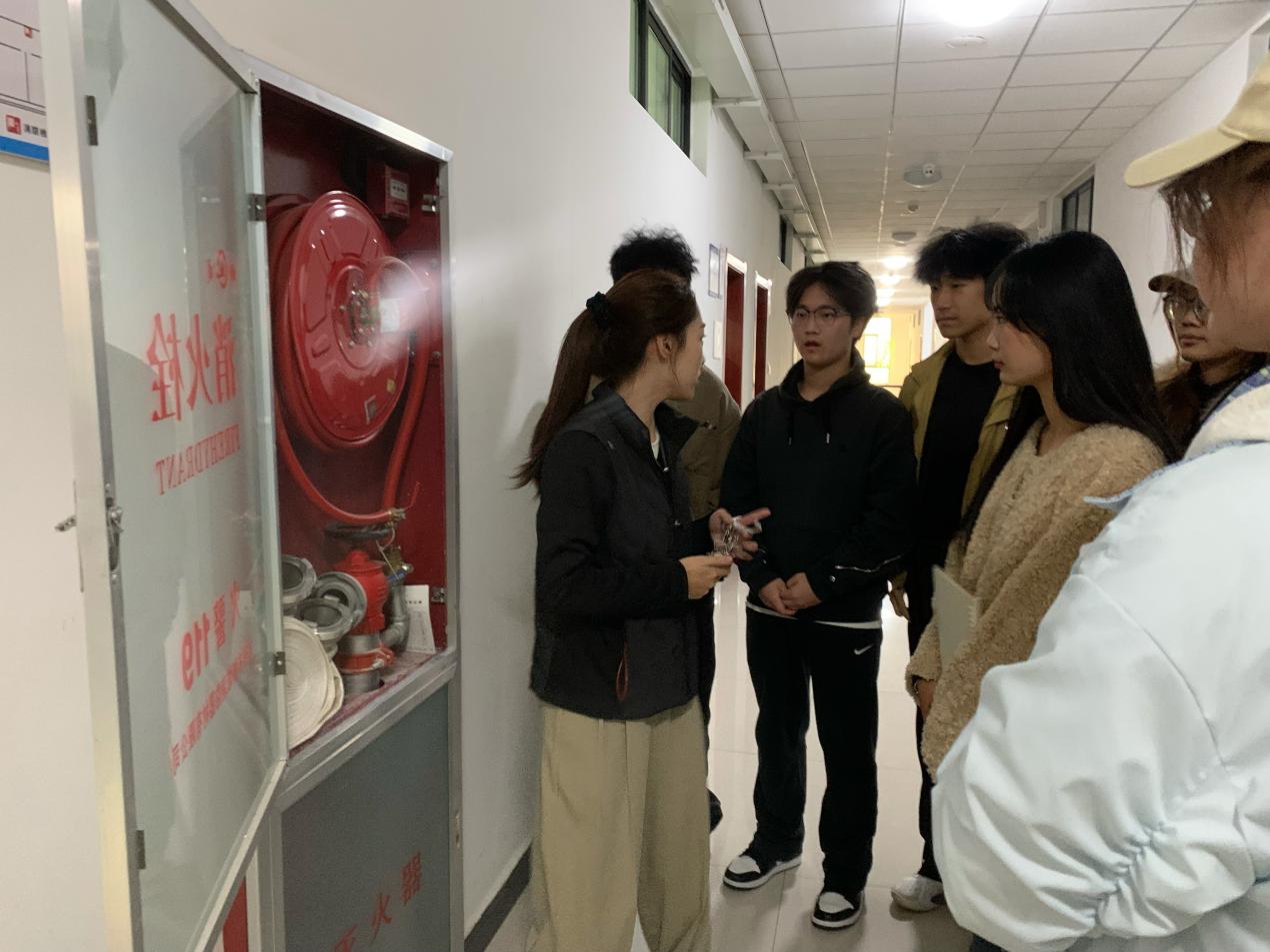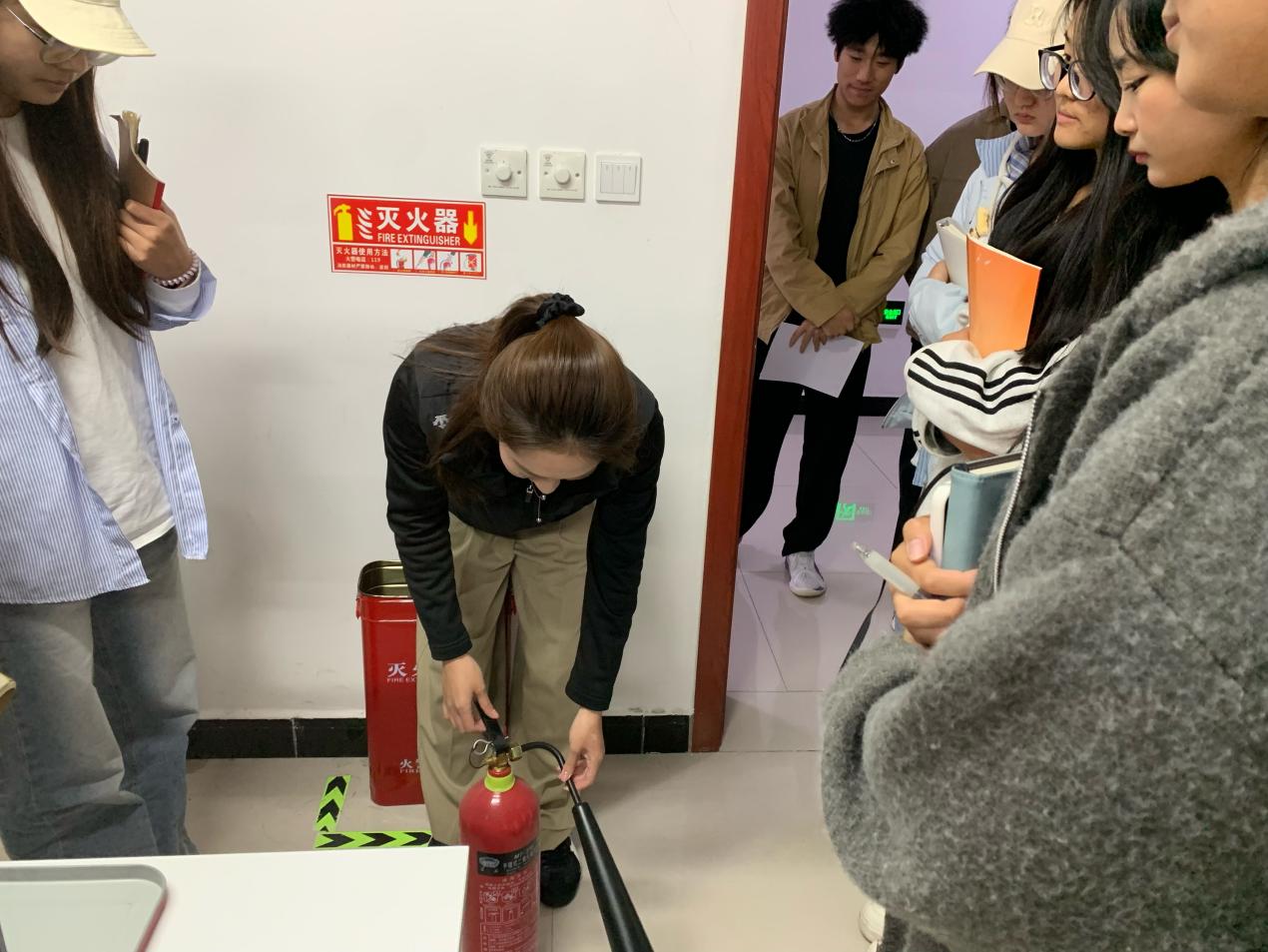活动现场,同学们先后走进物流仿真实训室、直播间、电子商务沙盘实训室等教学场地,围绕不同场地的消防风险点、特殊消防注意事项,以及灭火器、消火栓等器材的基础使用知识展开学习,深刻领会“预防先行”“小火会灭”“大火会逃”的消防核心要义;随后在实训室管理员带领下,大家实地查看永利集团官网实训教室各楼层及楼梯间灭火装备,管理员同步详细讲解墙壁消火栓、应急灭火箱的功能作用及消防水带的存放位置与取用规范,并组织学生分组开展灭火器实操练习——从提握灭火器的正确姿势、保险销的拔除方法,到对准火源根部按压喷射的操作要点,管理员全程逐项示范、反复强调规范,引导学生树立消防实战意识,确保每位同学都能熟练掌握操作技巧,切实将“小火会灭”的技能落到实处。