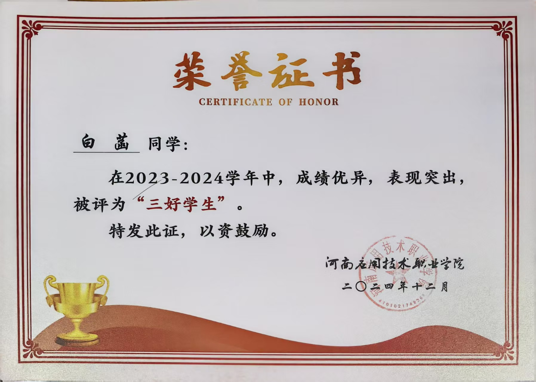 从专业深耕到实践奉献,从竞赛突破到研学成长,白菡以“知不足而奋进,望远山而前行”为人生信条,用扎实的行动书写着青春答卷,诠释了新时代大学生的卓越风采。