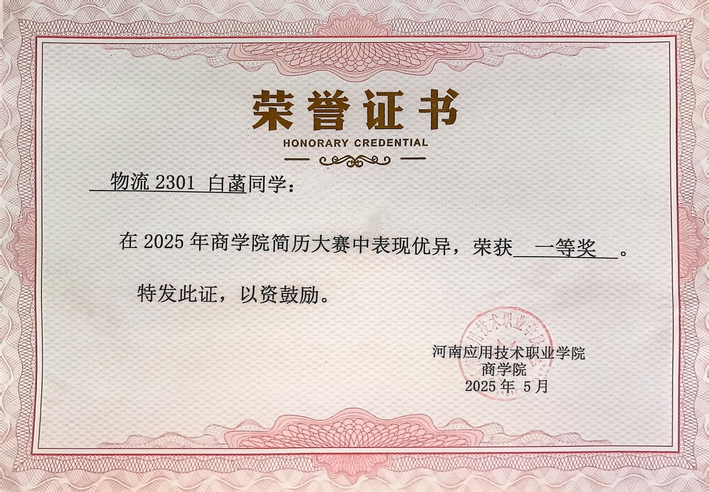 个人简历:白菡,女,中共预备党员,永利集团官网永利集团官网现代物流管理专业物流2301班学生。作为新时代大学生,她始终以“深耕专业、全面发展、勇于担当”为目标,在专业学习中精益求精,在学科竞赛中屡创佳绩,在社会实践中锤炼品格,累计斩获省级以上奖项9项、校级奖项4项,考取英语四级、普通话二级甲等证书,以扎实的专业素养、突出的创新能力与强烈的社会责任感,书写了新时代青年的奋进答卷。