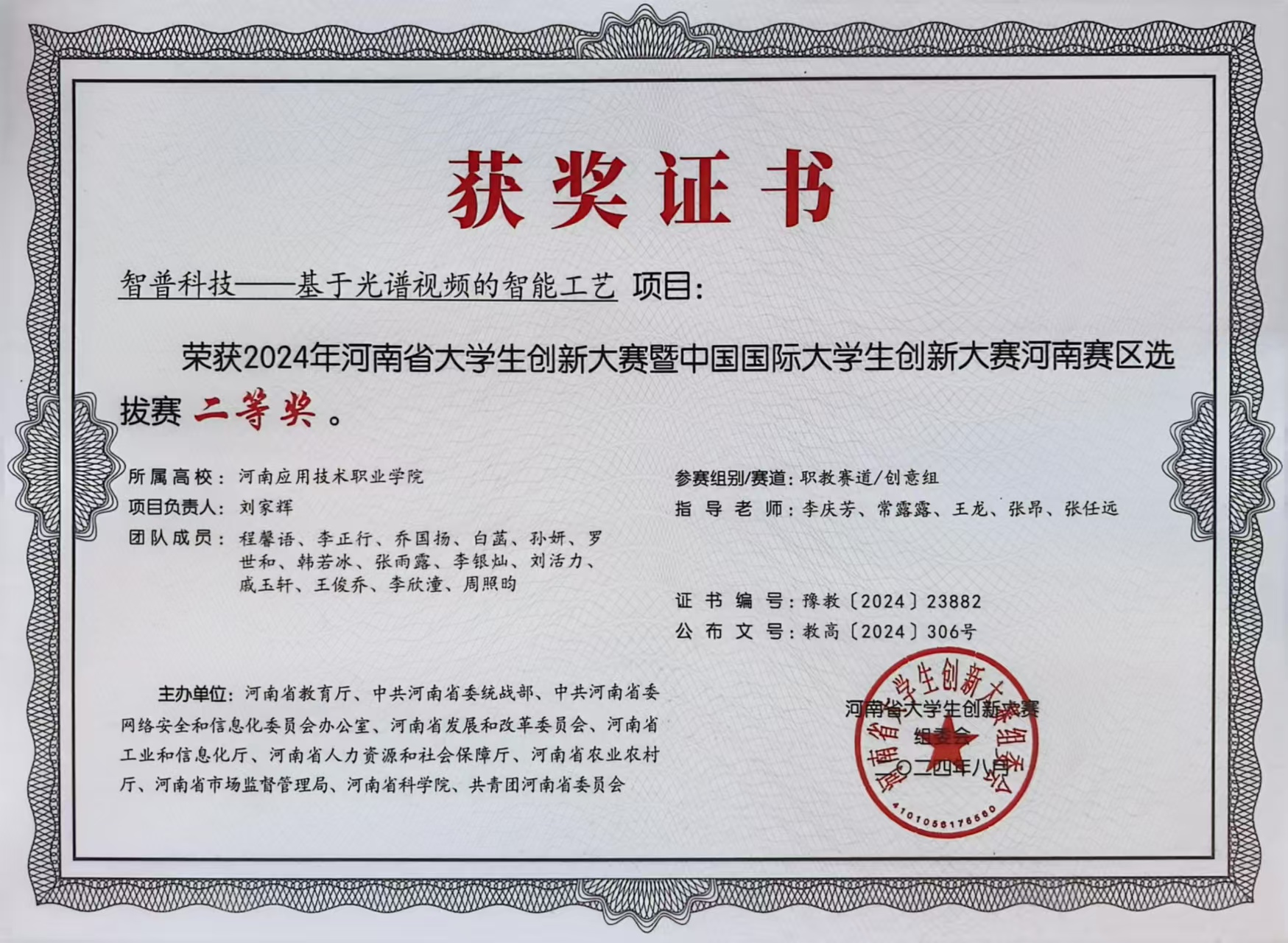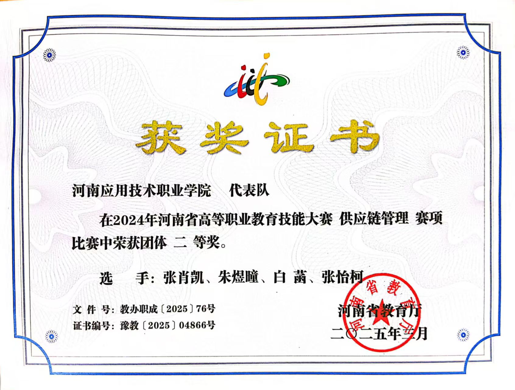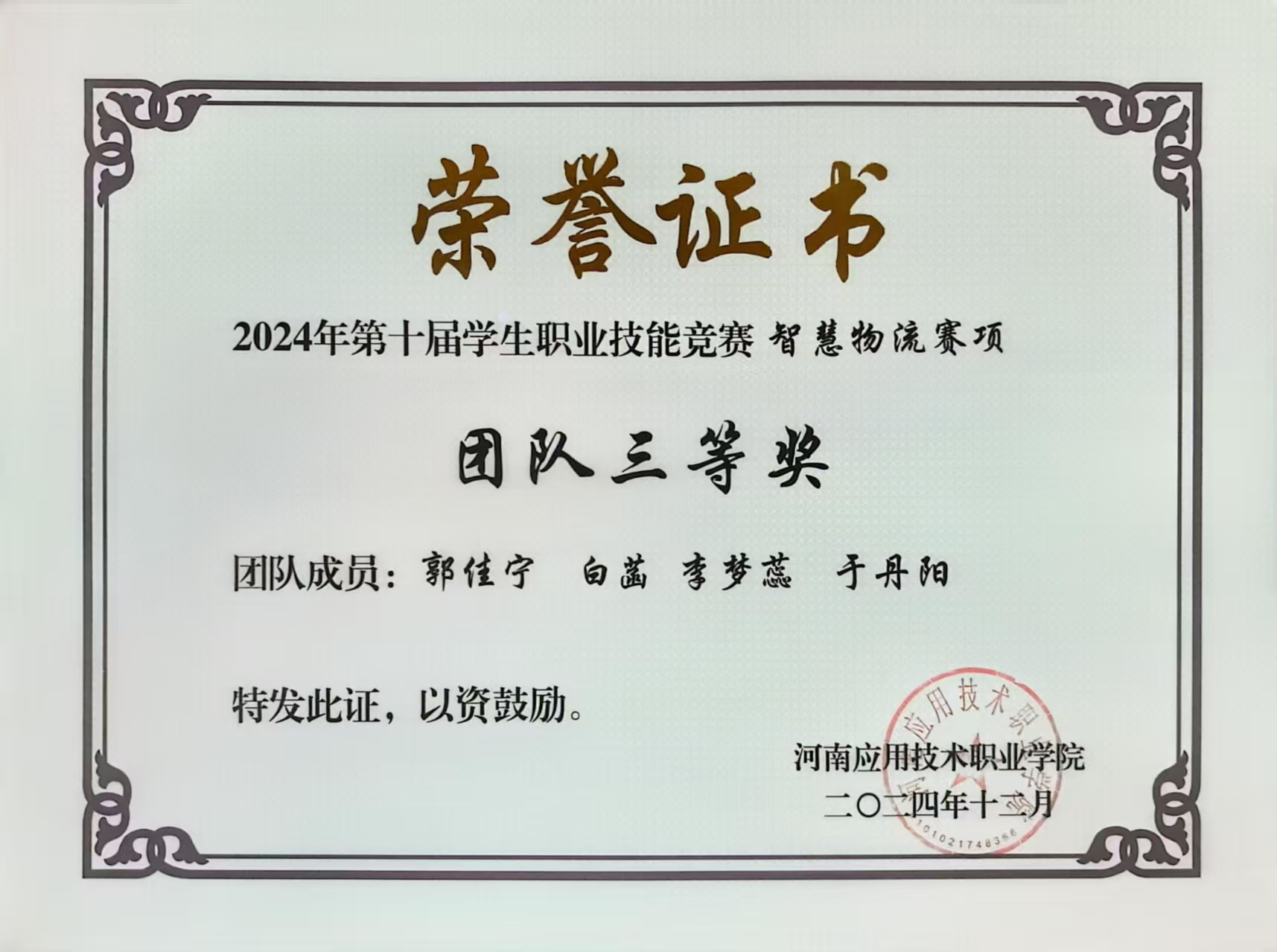在职业技能竞赛中,她同样稳步前行、表现亮眼。2024年,她与团队成员组队参与第十届学生职业技能竞赛智慧物流赛项,备赛期间,他们充分利用学校实训资源,反复模拟仓储布局规划、货物分拣调度、物流系统操作等竞赛环节,针对实操中的薄弱点集中强化训练,通过分工协作、默契配合弥补各自短板,最终荣获团队三等奖。此外,她还于2024年10月参与河南省高校实验室安全知识与技能大赛,赛前系统学习实验室安全规范、危险品管理、应急处置等知识,结合物流实训中的安全操作经验强化练习,最终凭借扎实的知识储备与规范的实操表现顺利通过考核,获得合格证书。
