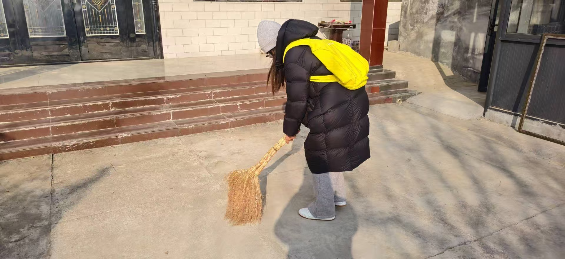 扫帚的重量会让手臂发酸,反复弯腰的动作也让腰腹感到疲惫。可当我看着原本有些杂乱的地面一点点变得干净整洁时,心里的成就感就油然而生。休息时,看到院子里的长辈们坐在门口晒太阳,笑着跟我说“丫头辛苦了”,那种被认可的温暖,让所有的疲惫都烟消云散了。
