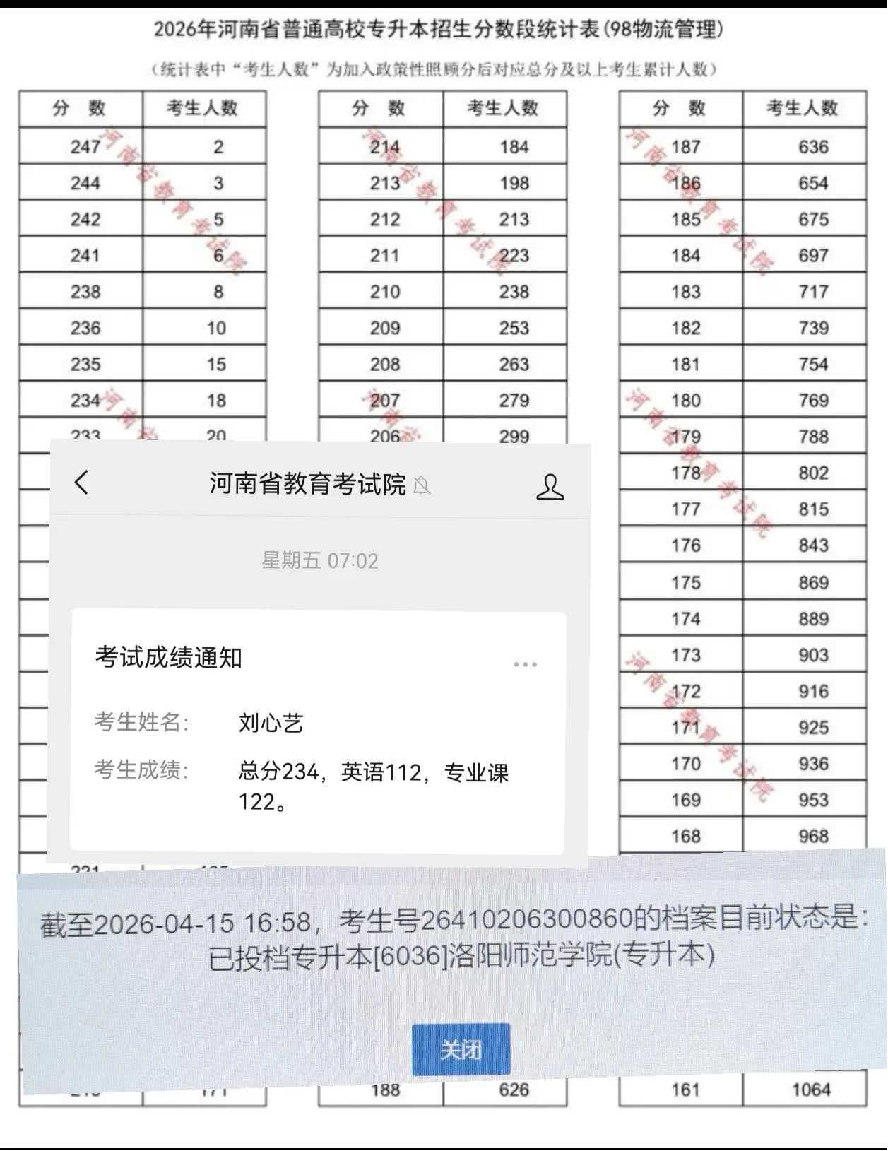 物流2303班刘心艺以总分234分,排名物流管理专业河南省第16名。