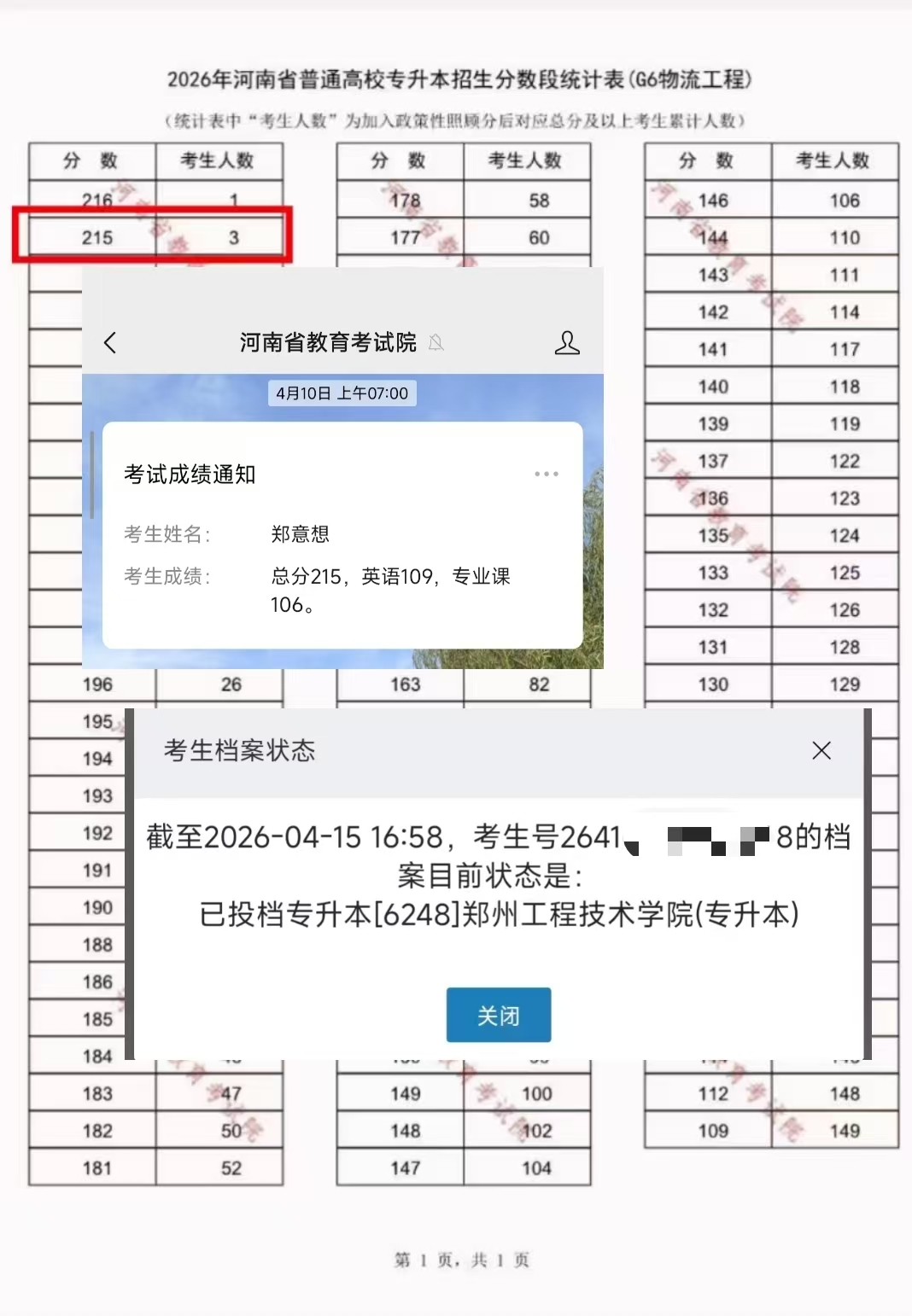 营销2301班郑意想以总分215分,斩获物流工程专业河南省第2名。