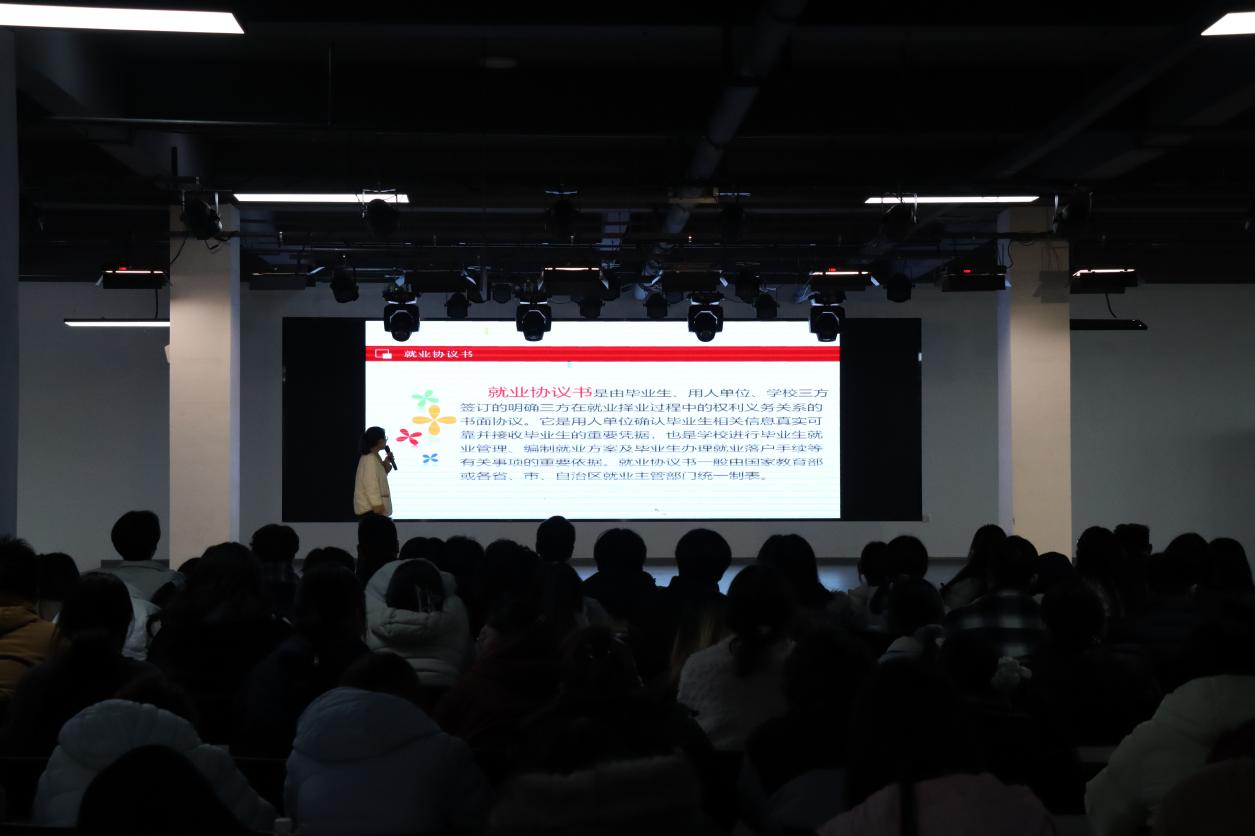 讲座中,吴淼专员围绕三大核心问题展开详细讲解,直击学生就业痛点。针对就业平台数据填报,明确填报规范、注意事项及常见错误,强调数据真实准确的重要性,指导学生规范完成信息登记与确认。关于实习和毕业流程,她梳理了实习备案、考核认定、毕业材料提交等关键节点,提醒学生合理规划实习时间,衔接好实习与毕业环节。针对档案转递这一重点问题,她解读了档案转递的政策要求、流程步骤及接收规范,严禁个人自带档案,告知学生如何查询档案流转状态,规避档案丢失、转递错误等风险。
